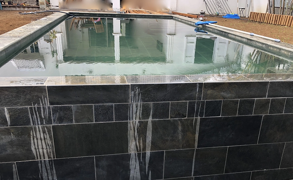 Une piscine à débordement de dimensions 8,5m x 4,5m, entièrement en béton armé, a été aménagée avec un carrelage en pierre naturelle. Un système de filtration professionnel a été installé par un pisciniste, et un local dédié a été construit pour abriter l'équipement de filtration, ainsi qu'une douche et des toilettes pour plus de commodité.